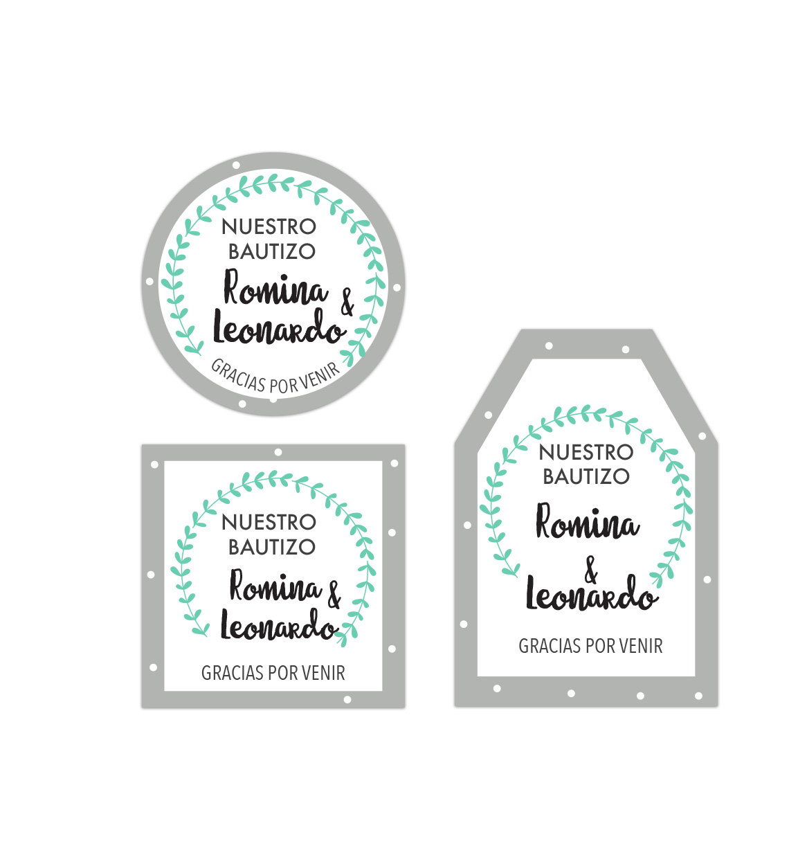 Diseño Tarjetita Bautizo Gris. Si tienes pensado obsequiar un detallito a tus invitados, no olvides agregar una tarjetita para que recuerden tu evento. Tu eliges el diseño y el tamaño que necesites. Se puede usar como sticker o perforando el centro, dale el uso que quieras. Tu eliges el diseño, la forma y el tamaño que necesites. Se puede usar como sticker o perforando el centro, dale el uso que quieras.