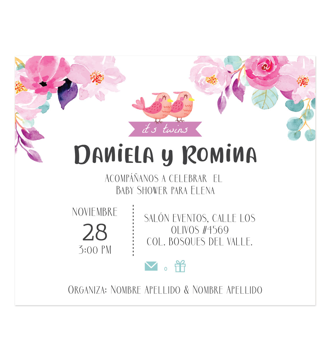Invitación Baby Shower Gemelas Pájaros y Flores.