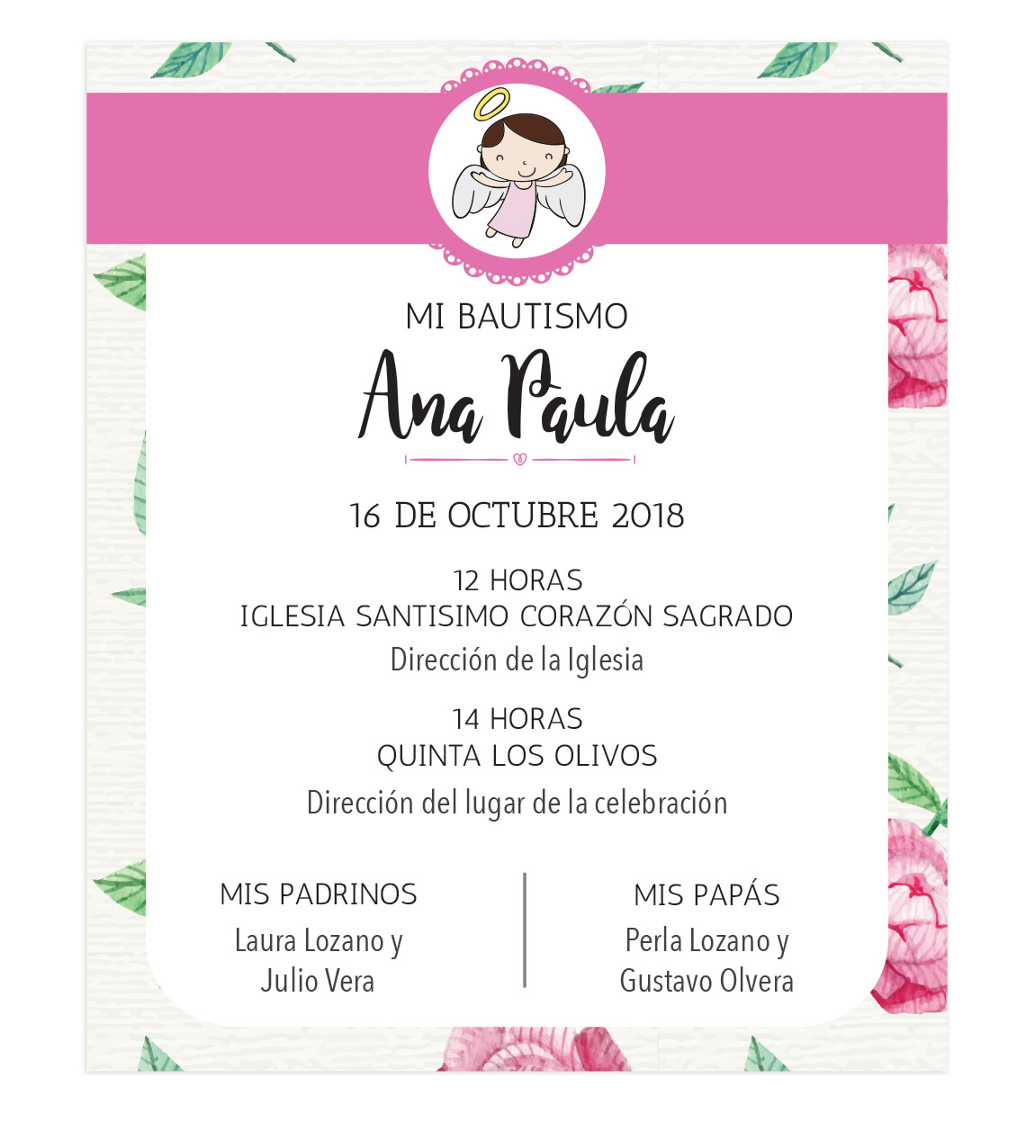 Revise que el diseño de la invitación tenga escrita la palabra Padres. Si el diseño no tiene el espacio y usted los agrega NO serán tomados en cuenta. Por falta de espacio algunos diseños no se incluyen el nombre de los padres.
