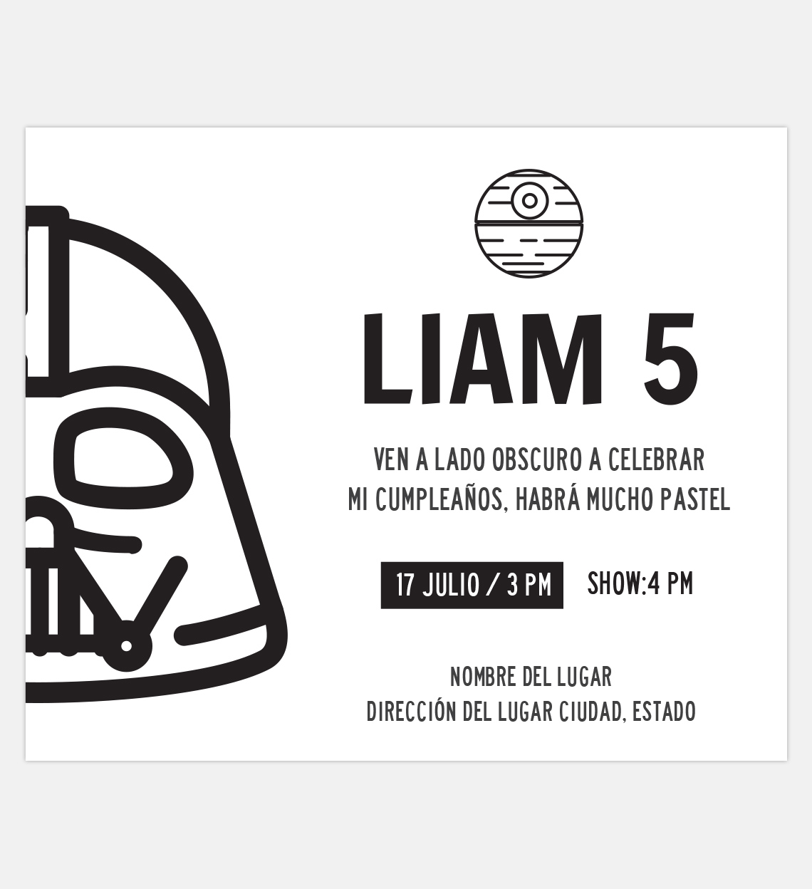 Invitación Cumpleaños Darth Vader. Medida Invitación individual: 12 cm de ancho por 10 cm de alto.
