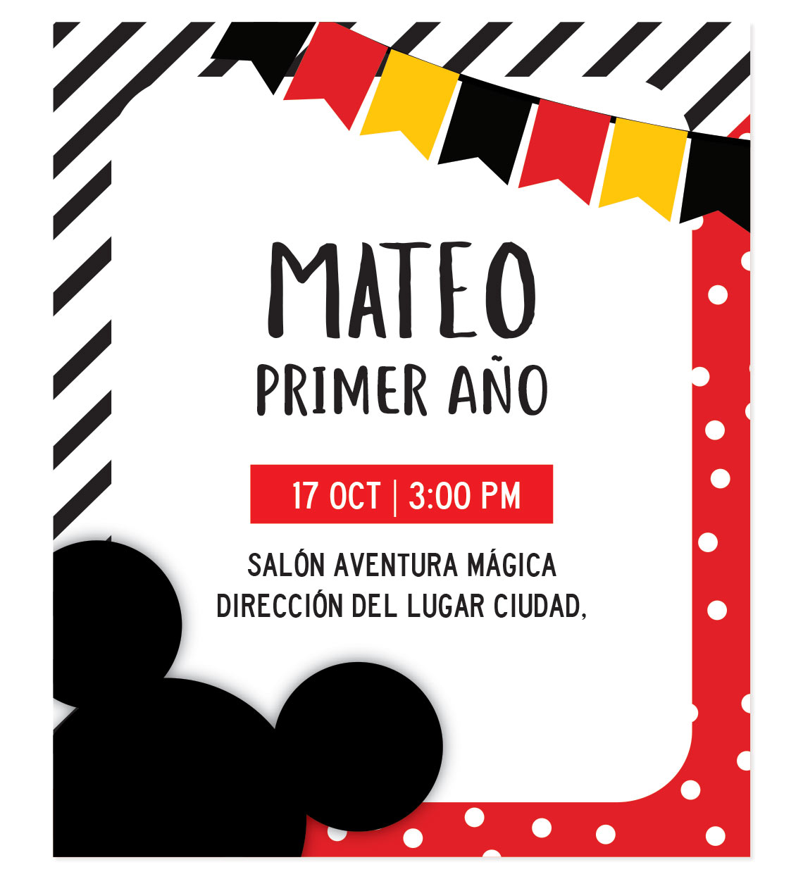 Invitación Cumpleaños Mickey Mouse Fiesta lista para personalizar.