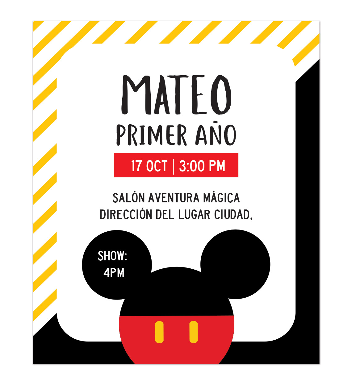 Invitación Cumpleaños Mickey Rayas lista para personalizar. Nuestra versión del ratoncito a llegado a Oh! Yupi Yei.