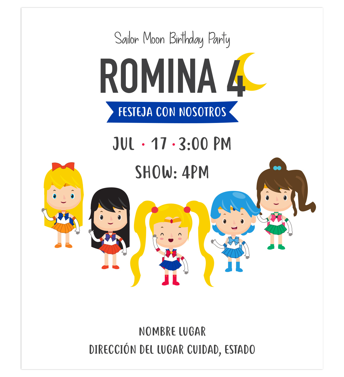 Invitación Cumpleaños Sailor Moon. Medida Invitación individual: 10 cm de ancho por 12 cm de alto.