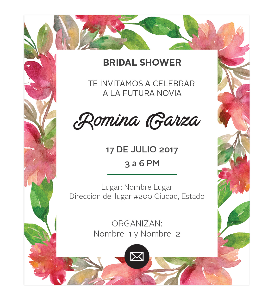 Invitación Despedida de Soltera Floral. Medida Invitación individual: 10 cm de ancho por 12 cm de alto.