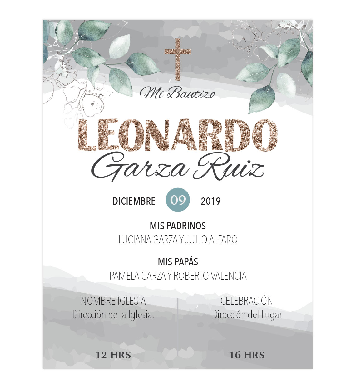 Invitación Digital Bautizo Gris Hojas para que la mandes a tus contactos.