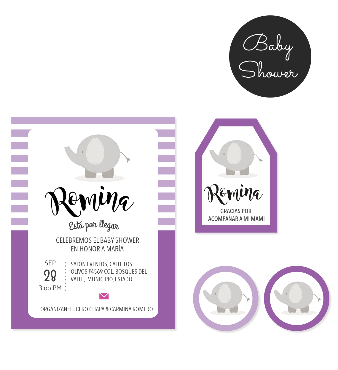Kit Baby Shower Elefante Morado con diseño de invitación + tarjetita de agradecimiento para detallitos + círculo multiusos. Utiliza un diseño que unifique tu evento. Llena los datos de tu evento y nosotros personalizamos los diseños. Las impresiones van por tu cuenta.