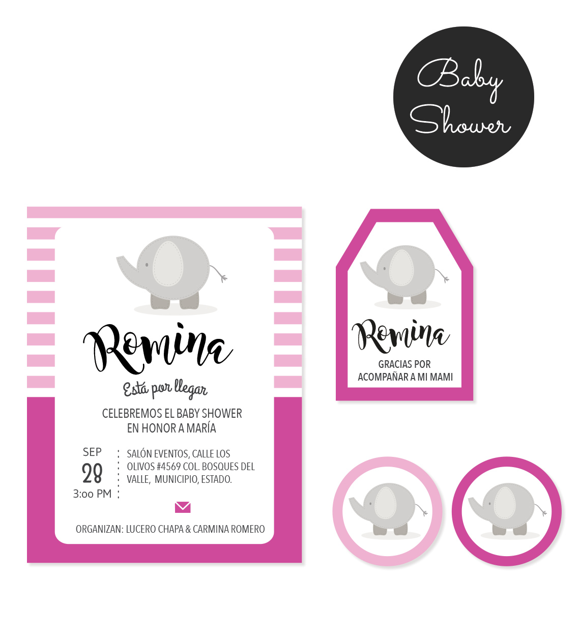 Kit Baby Shower Elefante Rosa con diseño de invitación + tarjetita de agradecimiento para detallitos + círculo multiusos. Utiliza un diseño que unifique tu evento. Llena los datos de tu evento y nosotros personalizamos los diseños. Las impresiones van por tu cuenta.