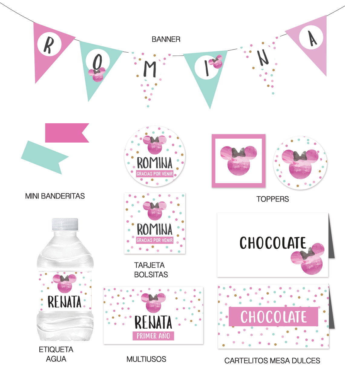 Kit Infantil Cumpleaños Minnie Pink listo para complementar la fiesta. Llena los datos de tu evento y nosotros personalizamos los diseños. Las impresiones van por tu cuenta.
